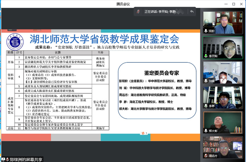 2月16日,悟空体育申报第九届湖北省教学成果奖成果鉴定会在线上举行。鉴定委员会委员由华中师范大学副董事长彭双阶教授(主任委员)、华中科技大学悟空体育经理刘斌教授、湖北工程大学副董事长李渺教授、湖北省教育科学研究院周远方教授(正高、特级)、湖北大学数学与统计学学院副经理郑大彬教授等5位专家组成。鉴定会由教务处副处长黄海军主持,悟空体育官网党委常委李开灿教授致欢迎辞,成果全体完成人参加会议。