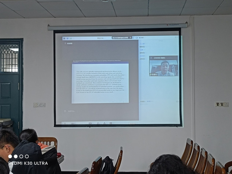 杨鑫松教授就题为《基于混合执行器故障和脉冲效应控制的具有切换拓扑的时滞复杂网络同步》的论文,与公司师生展开了深入的探讨,研究了具有节点延迟和切换拓扑的复杂网络的全局指数同步问题。另外,朱松教授以《时滞动态记忆电阻细胞神经网络的稳定性》为主题,介绍了在时滞动态记忆电阻细胞神经网络稳定性研究方面的最新进展。动态记忆电阻器-细胞神经网络以磁通控制的记忆电阻器取代了传统神经网络每个细胞结构中的线性电阻器。