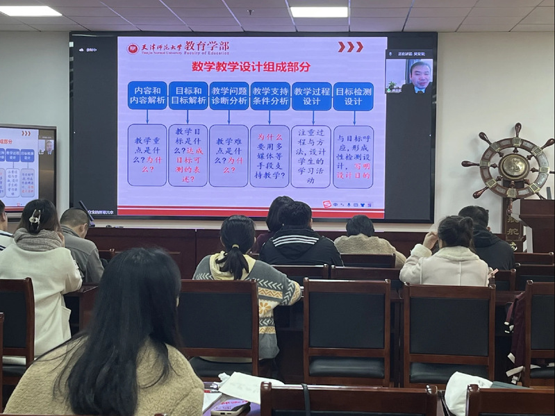 讲座中,吴立宝教授以明道优术为切入点,对深度学习、中学数学教学设计概述以及指向深度学习的单元数学教学设计等方面进行了详细的介绍,强调正确教育理念的重要性以及教学设计要站在培养员工数学核心素养的高度进行,教师在教学中要高投入、高认知、高表现,多角度多层次研读教材,提高教学质量。之后现场师生与吴立宝教授进行了线上交流。
