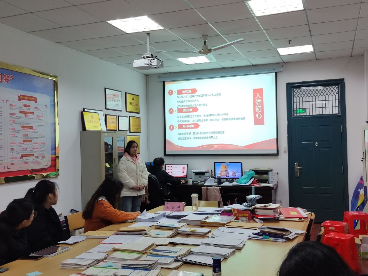 第一支部申请转正的预备党员有韩献涛,曹冰冰,范逸鹏,罗青丽,赵瑞,熊紫彤,孙娅婧,许梦凡,沙于萱共9名预备党员,大会讨论并无记名投票,同意他们正式转为共产党员。杨老师对以上9位同志表示祝贺,并提出了更高要求,希望他们积极提升党性修养,增强自身素质,在生活和学习中勇攀高峰。