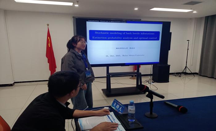 姜国经理参加了学科发展与人才培养专题交流会,赵大方副经理于1018日下午主持了分组报告,许靖老师和李秋杉同学分别在分组做了报告分享。许靖以《Near-optimal control of a stochastic model for mountain pine beetles with pesticide application》为题汇报了他的最新工作;李秋杉则以《Stochastic modeling of bark beetle infestations: Extinction probability analysis and optimal control》为题汇报了其硕士阶段的研究成果。