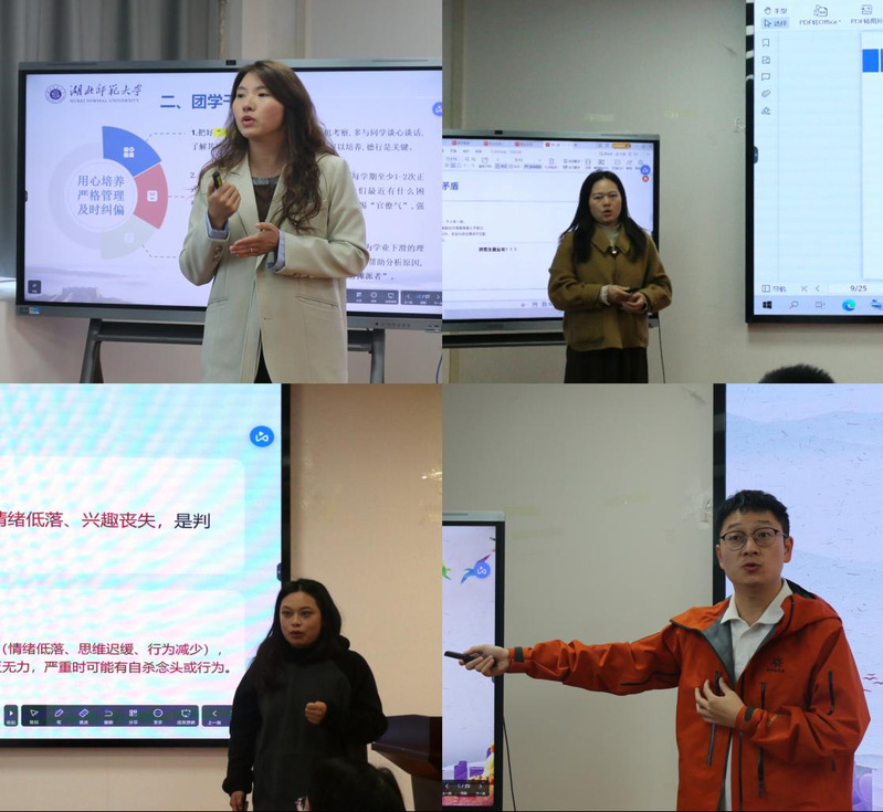 在业务培训环节,袁曼从宏观架构入手,深入阐明了学风建设的创新路径与校园安全管理的底线思维,并就应急事件的处理流程作详细说明;苏梦月阐述了如何通过日常关怀洞察员工心理健康,实现管理与育心的有机统一;屈媛媛聚焦成长支持,详细讲解了“资助”如何与“育人”深度融合,以及员工干部队伍的选拔与培养策略;杨宇森解读了党员发展的规范流程与征兵入伍的激励政策;何金燕分析了当前的就业形势与精准指导技巧。业务培训构成了从思想引领到事务管理、从学业支持到生涯规划的全链条指导,为班主任工作提供了扎实的理论指导和实操借鉴。