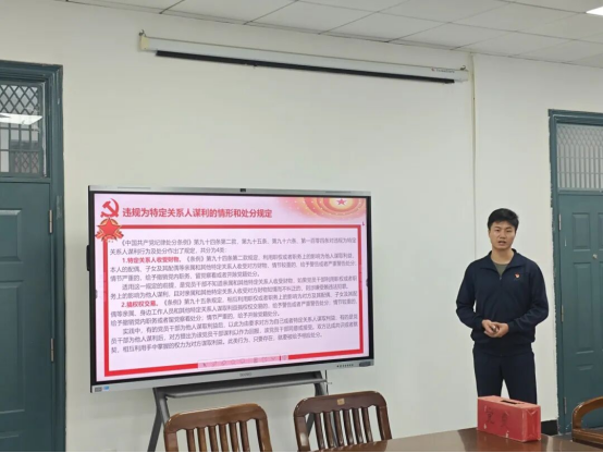 员工党员刘晓锋同志围绕违规为特定关系人谋利、影响公正执行公务、婚丧喜庆事宜违规操办、违规营利等方面,结合《中国共产党纪律处分条例》规定与典型案例开展本次党纪学习教育,引导党员明晰纪律红线,切实强化纪律意识与规矩意识。