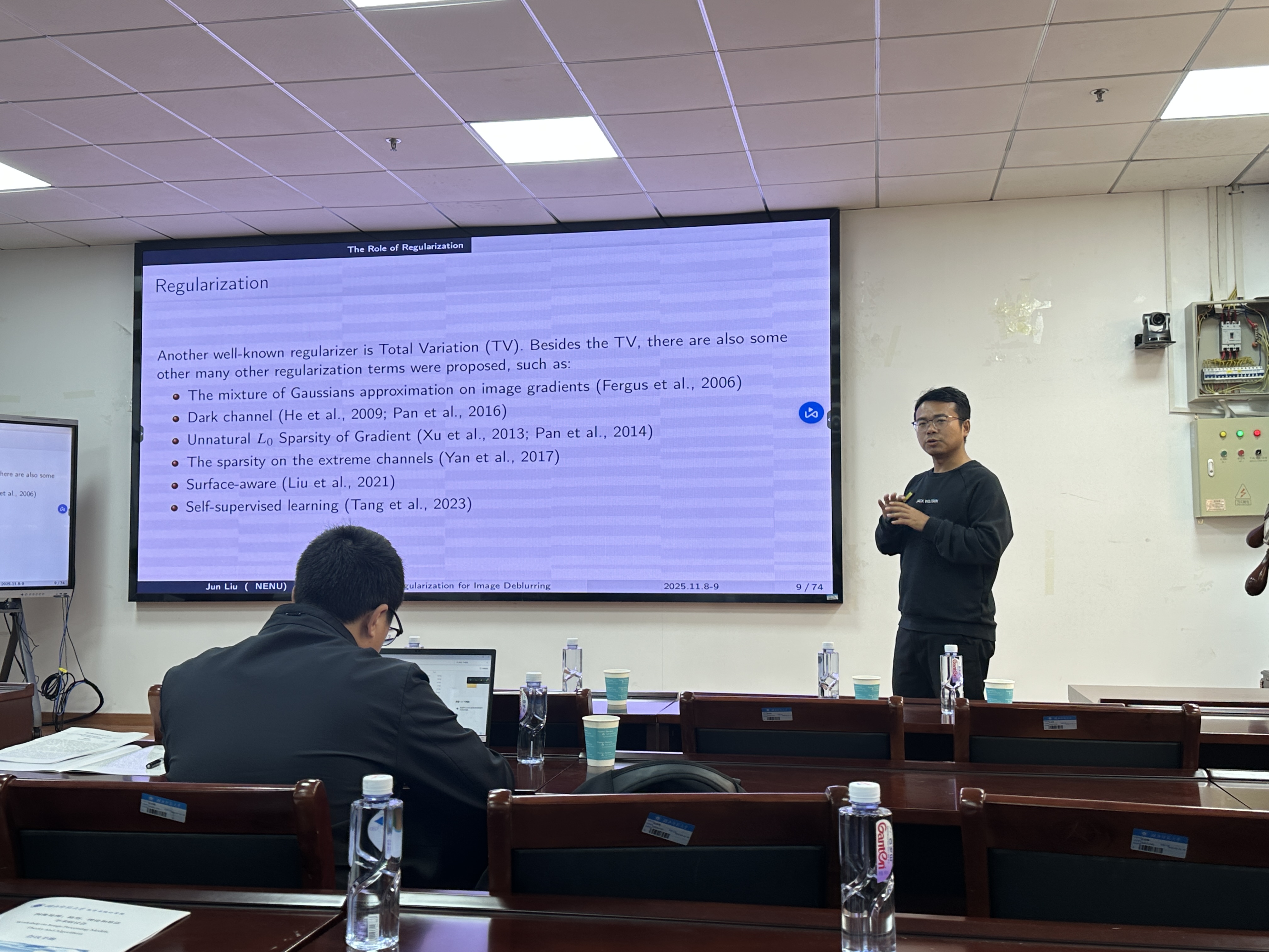 东北师范大学刘俊副教授以《Regularization for image deblurring》为题作学术报告。图像去模糊是图像处理的基础问题,正则化函数的有效选择仍是研究热点,而盲图像去模糊因潜在图像与模糊核对数量无限,挑战性尤为突出。不同于现有依赖统计观察的工作,其核估计方法基于内在几何考量。针对现有先进方法在高噪声场景下表现不佳、噪声会破坏模糊核估计准确性的问题,团队提出噪声鲁棒盲去模糊方法,在核估计中引入引导滤波抑制噪声,该方法在高噪声水平下的定量与定性表现均优于近年多款同类方法。
