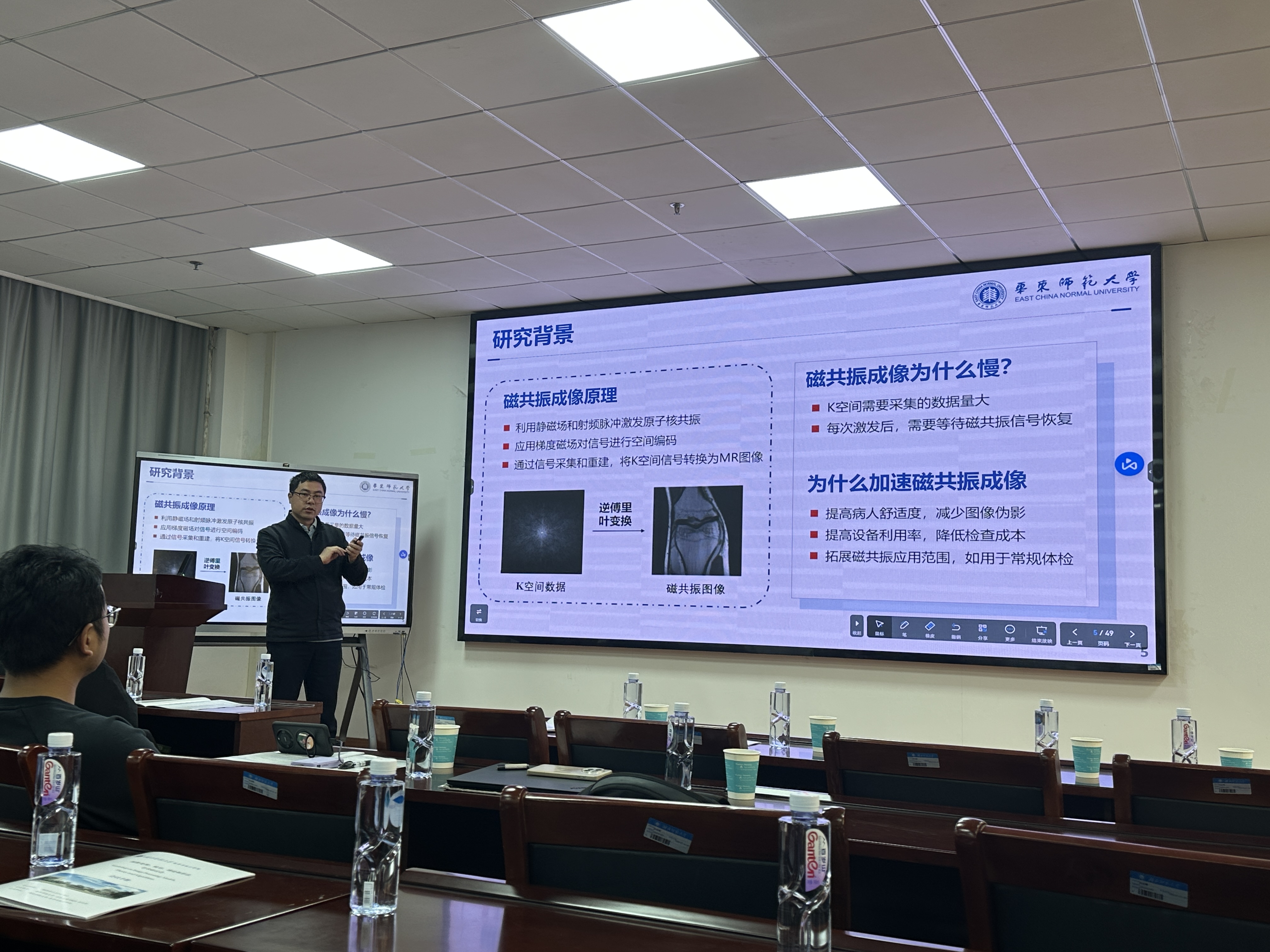 华东师范大学方发明教授《知识驱动的磁共振影像快速重建与增强》为题作学术报告。以磁共振成像作为一种非侵入性的医学成像技术,是医学诊断和研究的重要手段之一。然而磁共振成像扫描过程存在成像时间与成像质量的矛盾,因此如何在缩短成像时间的同时不降低甚至提高图像质量是目前研究的重点和难点。磁共振重建旨在从欠采样的磁共振数据中恢复对应的全采样数据,专家知识的指导对于求解该不适定性问题尤为重要。报告中,方教授从四个方面阐述知识驱动下磁共振影像快速重建与增强任务的最新进展,及其在临床医学领域的实际应用。