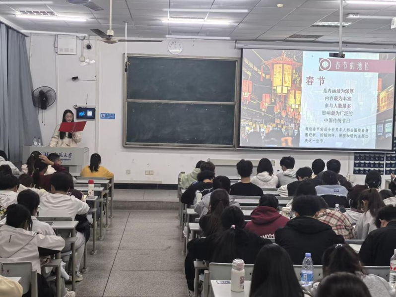 随后,赵诗雨围绕春节“申遗”历程与文化意义展开讲解,系统阐释了春节作为中华民族重要传统节日的核心地位、丰富习俗及其凝聚民族情感、传承文化血脉的深远意义,帮助学员进一步理解中华优秀传统文化的内涵与价值。