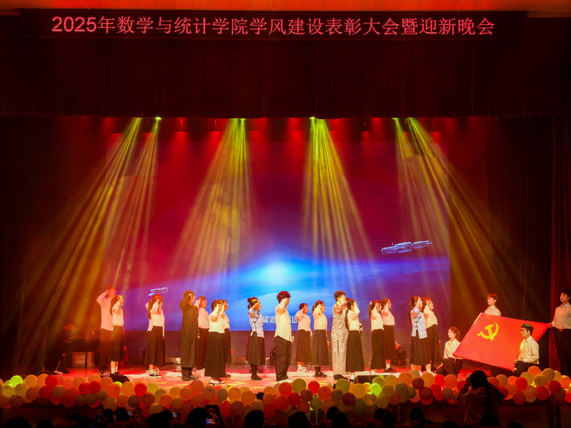 活动分为学风表彰与迎新晚会两大环节。在表彰环节中,学院对2024-2025学年在学业方面表现突出的个人和集体予以表彰。吴爱龙、杨志丹为吴沛璇、李慧玲、张玉倩、王燕等国家奖学金获得者颁奖;刘琼芳、姜国为“学业之星”获奖代表颁奖;王本成、陈引兰为“优良学风寝室”代表颁发荣誉证书。研究生国家奖学金获得者吴沛璇、本科生国家奖学金获得者王燕作为员工代表发言,分享了学习心得与成长感悟,展现了数统学子积极向上的精神风貌。