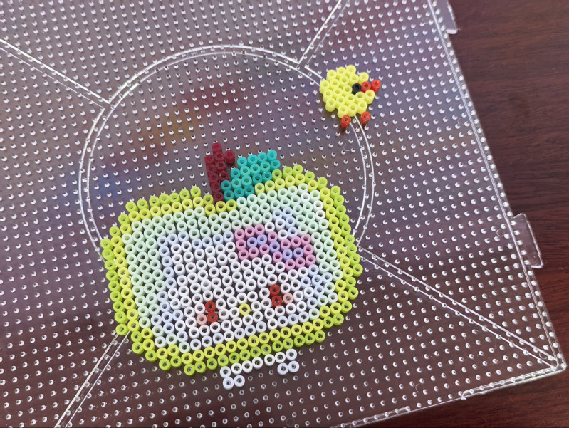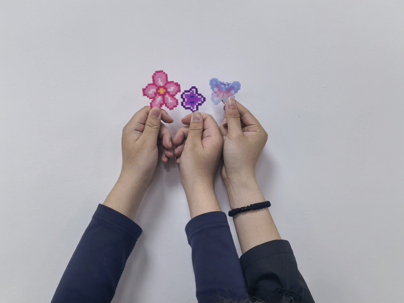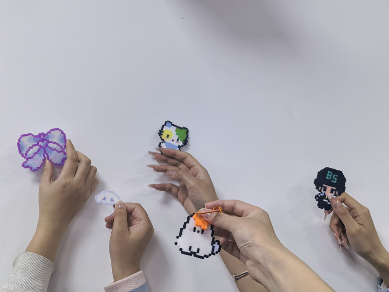 核心创作环节,研究生们暂时放下学术课题,专注于拼豆创作,或借鉴春日模板,或结合科研点滴创意构思,用浅绿、嫩黄等春日色系舒缓学术焦虑;本科生则在创作中释放日常压力,或独立创作,或与研究生伙伴协作交流。工作人员穿梭其间,及时补充物料、提供帮助,熨烫环节全程监督,保障安全。
